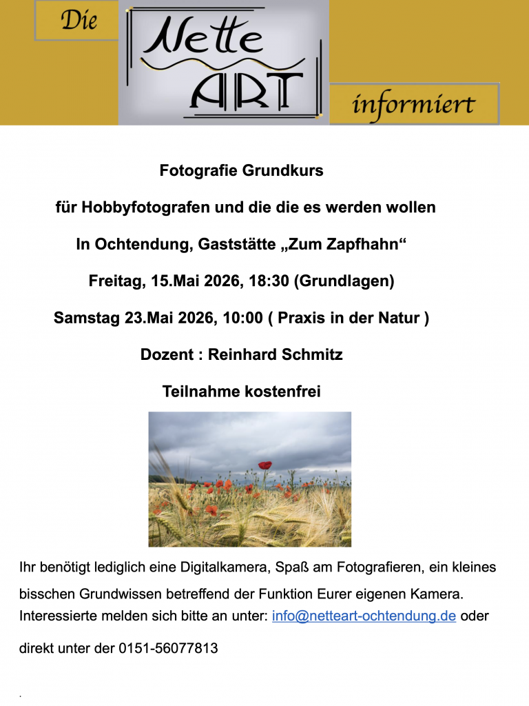 Für Einsteiger und Kameraneulinge bieten wir Foto Workshops an, die vom Dozenten Reinhard Schmitz durchgeführt werden. Die Workshops bestehen aus einem theoretischen und einem praktischen Teil (Outdoor z.Bsp. in der Natur oder einer Stadt). Alle Teilnehmer bekommen Handouts , um die Lerninhalte nochmals zu Hause in Ruhe nachvollziehen zu können.