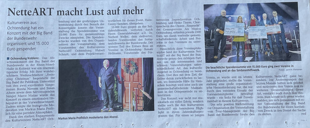 Übergabe der Spendenschecks aus dem Erlös der Veranstaltung an das Jugendzentrum Ochtendung, an den Chor Singsucht der Ars Musica Ochtendung und an das Soldatenhilfswerk